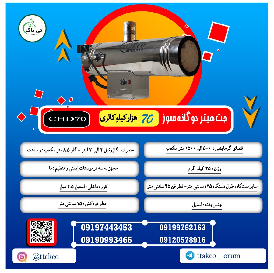 جت هیتر دوگانه‌سوز مدل 70 هزار تی تاک با توان حرارتی 70 هزار کیلوکالری در ساعت، برای گرمایش فضاهای مختلف مانند گلخانه‌ها، سوله‌ها، سالن قارچ مرغداری ،  سالن‌های صنعتی طراحی شده است. با قابلیت هوادهی 5000 مترمکعب در ساعت، این دستگاه می‌تواند فضاهای با حجم 1500 تا 500 مترمکعب را به طور مؤثر گرم کند. این دستگاه مجهز به ترموستات تنظیمات دما بوده و دمای فضا را مطابق با دمای تنظیم شده نگه می دارد. بدنه این دستگاه از جنس استیل بوده و به هیچ عنوان زنگ نمی زند و ذخیره گرمایش فوق العاده ای دارد.